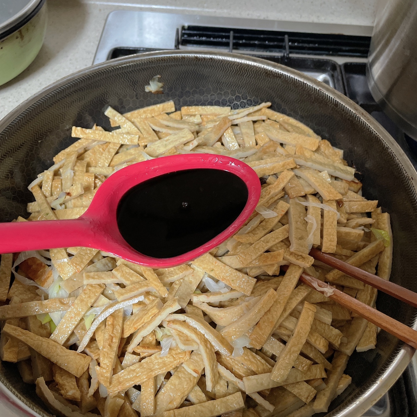 저는 사각어묵이 거의 20장 정도를 볶아서 간장을 한국자를 넣고 볶아주었어요! 요알못이라 계량 같은 거는 내 맘대로 하는 편인데요~ ㅋㅋㅋ 이해 안 가죠? 이게 한 숟가락 두 숟가락 넣다 보면 기억을 못 해요 ㅋㅋ 그래서 과하게 하지 않고 항상 적은 양을 넣으면서 맛보면서 합니다!